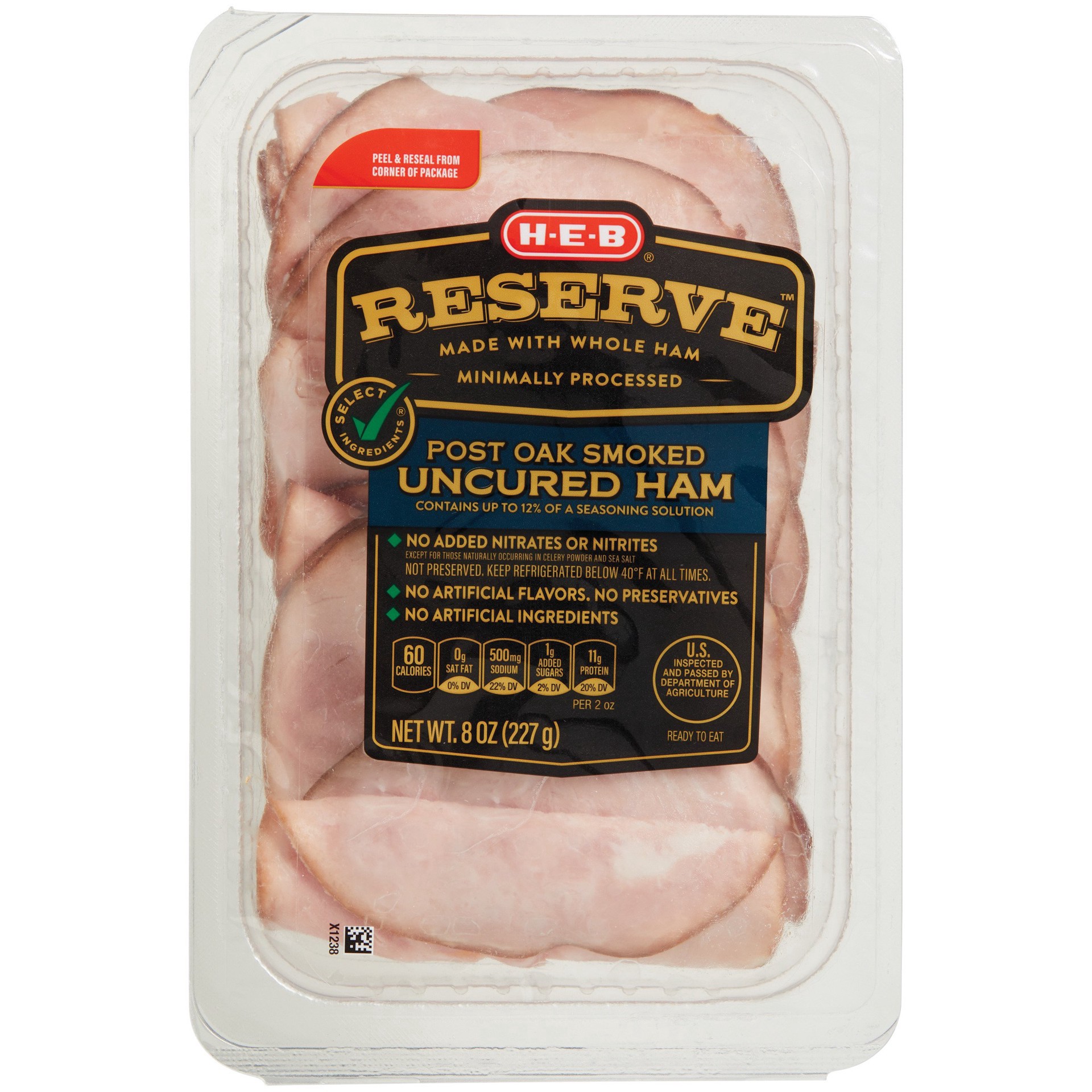 Full of unforgettable flavor, these slices of H-E-B Reserve uncured ham are arranged in a resealable tray for freshness. Made with whole ham that's smoked over Post Oak wood, this premium deli meat is…