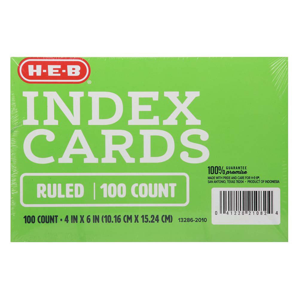 Stay organized and efficient with H-E-B Ruled Index Cards in White. This pack includes 100 high-quality index cards, each measuring 4" x 6". The ruled design provides ample space for writing notes, li…