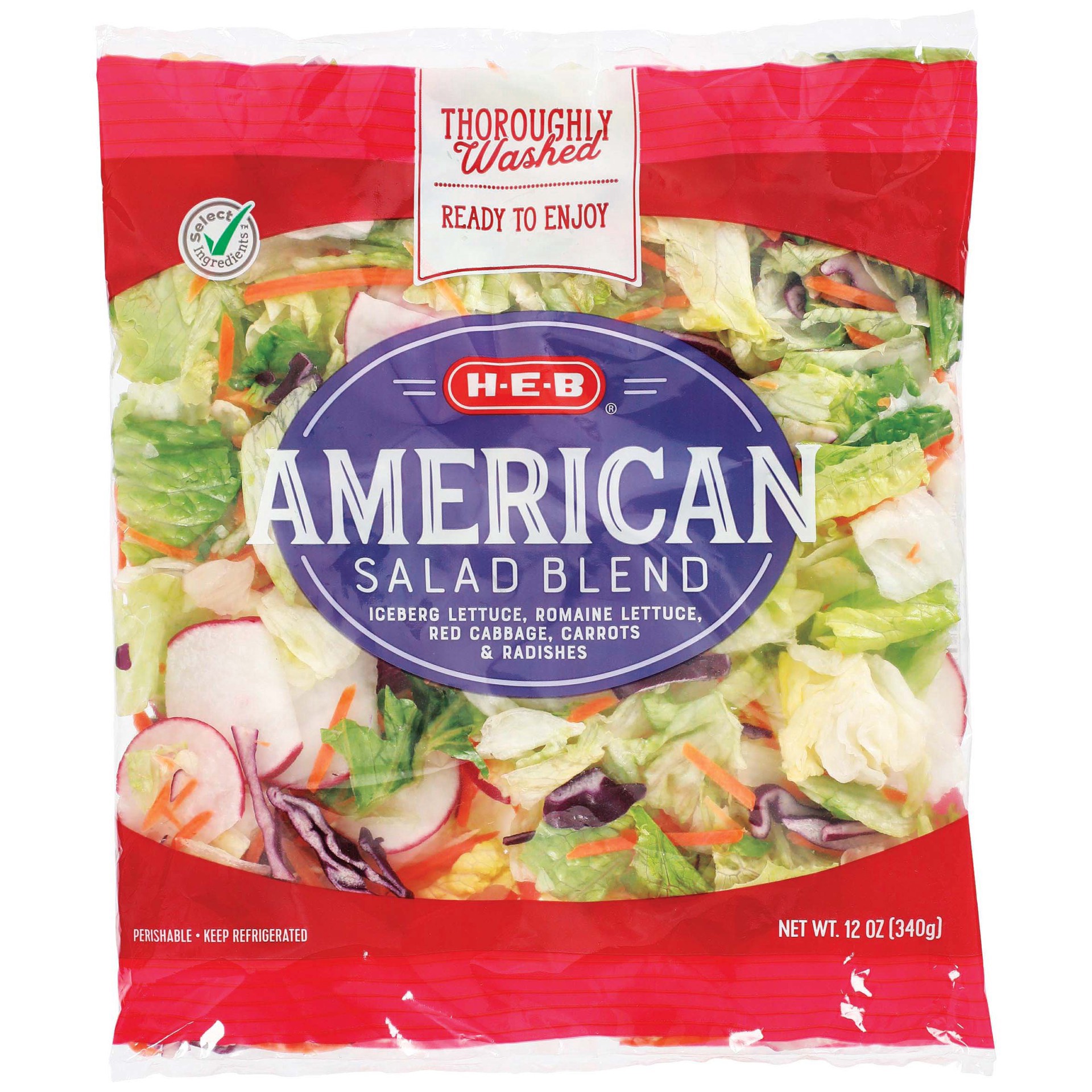 The next time you're tossing together a salad, reach for this H-E-B salad blend for a prepped and ready base. It has thoroughly washed iceberg, romaine, red cabbage, carrots and radishes. All that's l…