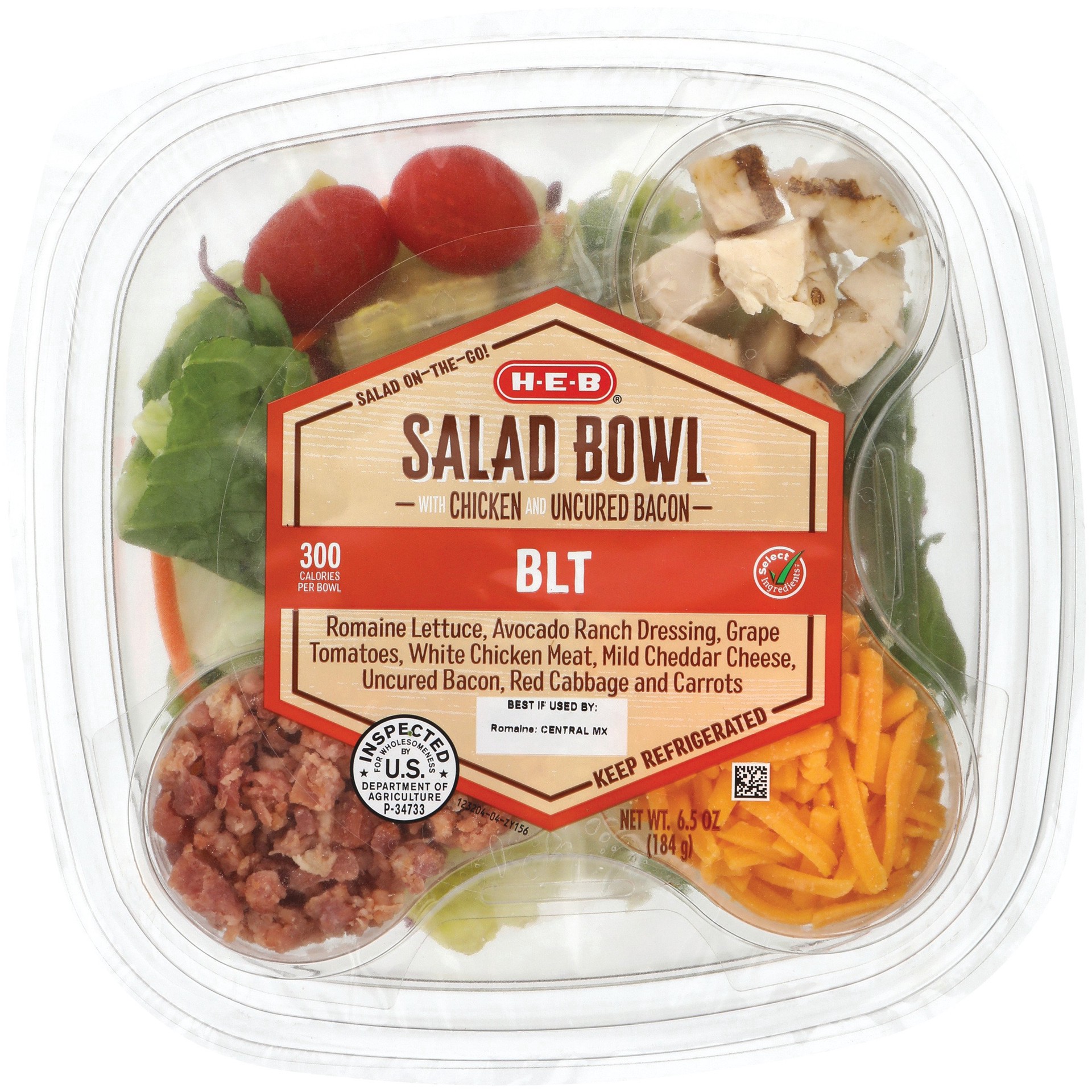 For a BLT-style salad on the go, sample this one from H-E-B. With romaine lettuce as the base, it's packed with grape tomatoes, white chicken meat, uncured bacon, and mild cheddar. Bringing it all tog…