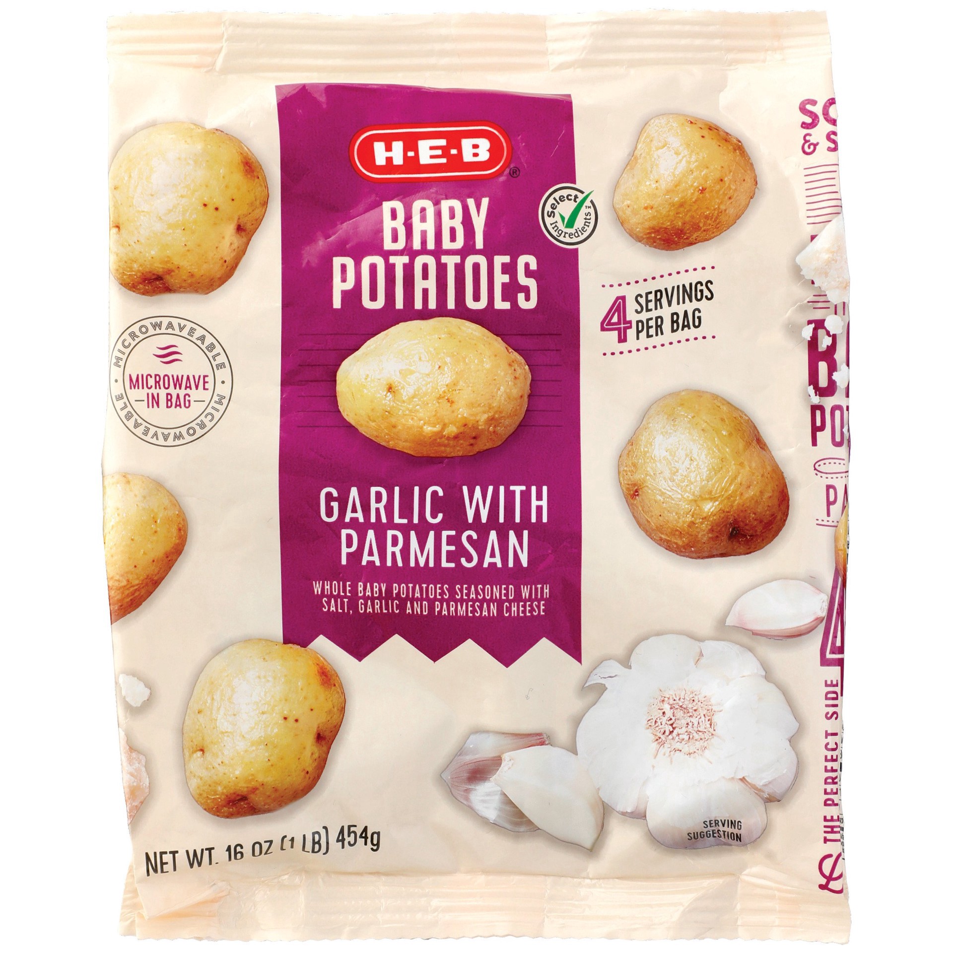 Microwavable right in the bag, these H-E-B frozen baby potatoes are seasoned with salt, garlic and parmesan cheese. They can also be cooked in the oven if preferred and make an easy dinner side or pot…
