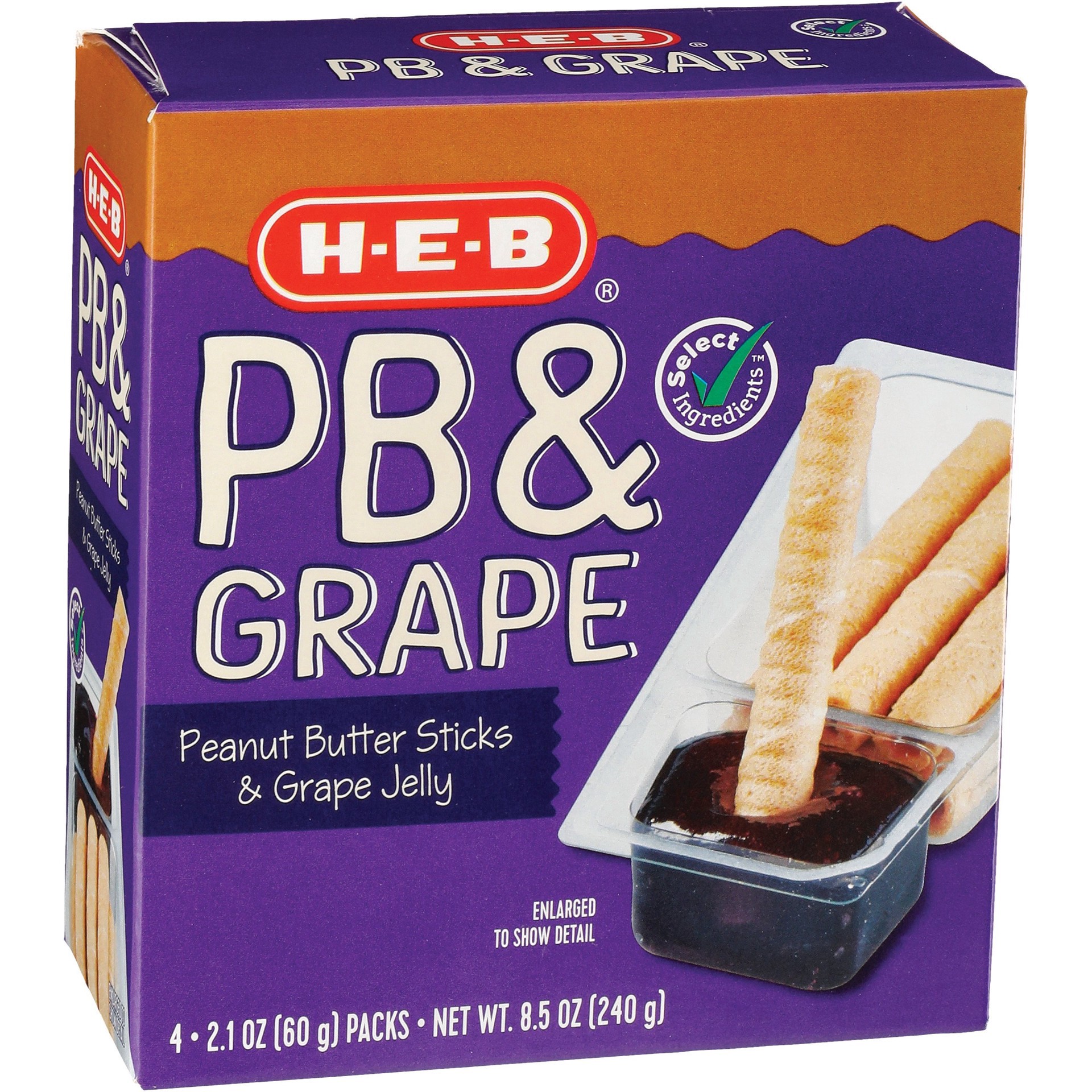 For a new spin on the classic PB&J, try these snack packs from H-E-B. Each one contains peanut butter-flavored wafer sticks for dipping into grape jelly.• 4 snack packs• Peanut butter wafer sticks• Si…