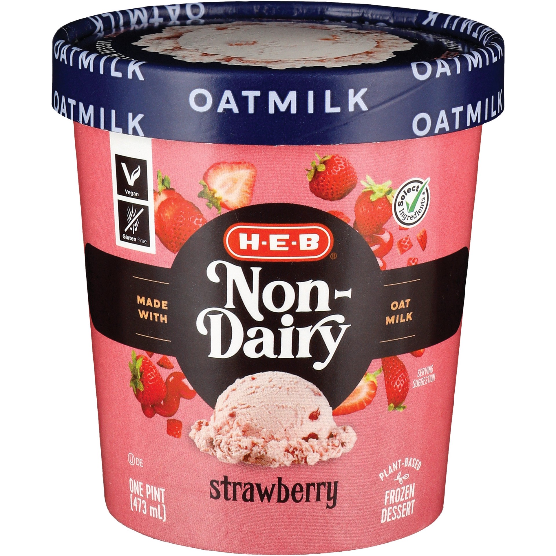 For all the taste of strawberry ice cream but without any dairy, try this Higher Harvest by H-E-B frozen dessert. Non-dairy and plant-based, it's made with oak milk and is bursting with bright berry t…