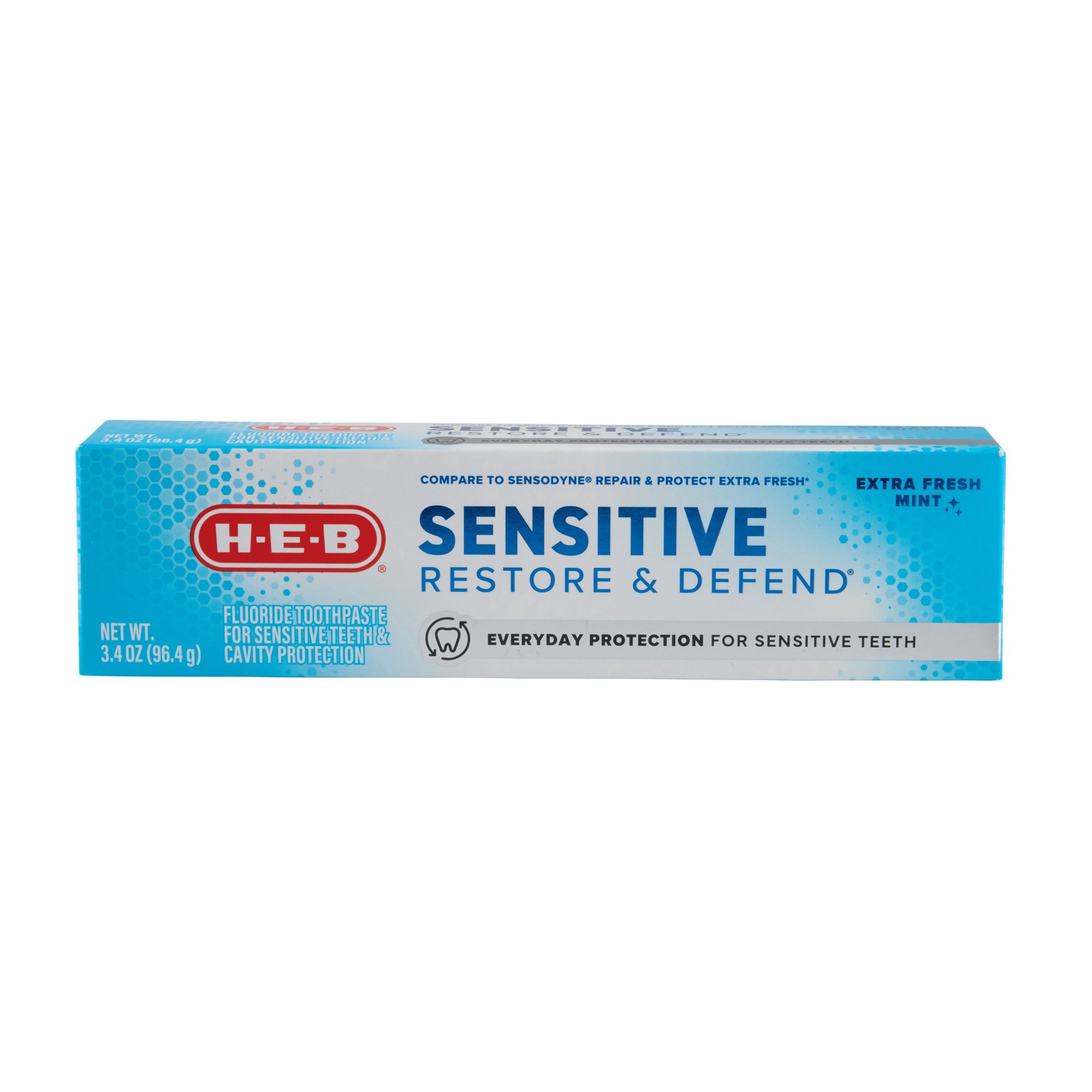 Reveal a whiter, more brilliant smile with H-E-B Fresh Mint Sensitive Toothpaste. Toothpaste for sensitive teeth and cavity prevention. Relieves painful sensitivity. Contains potassium nitrate to prot…
