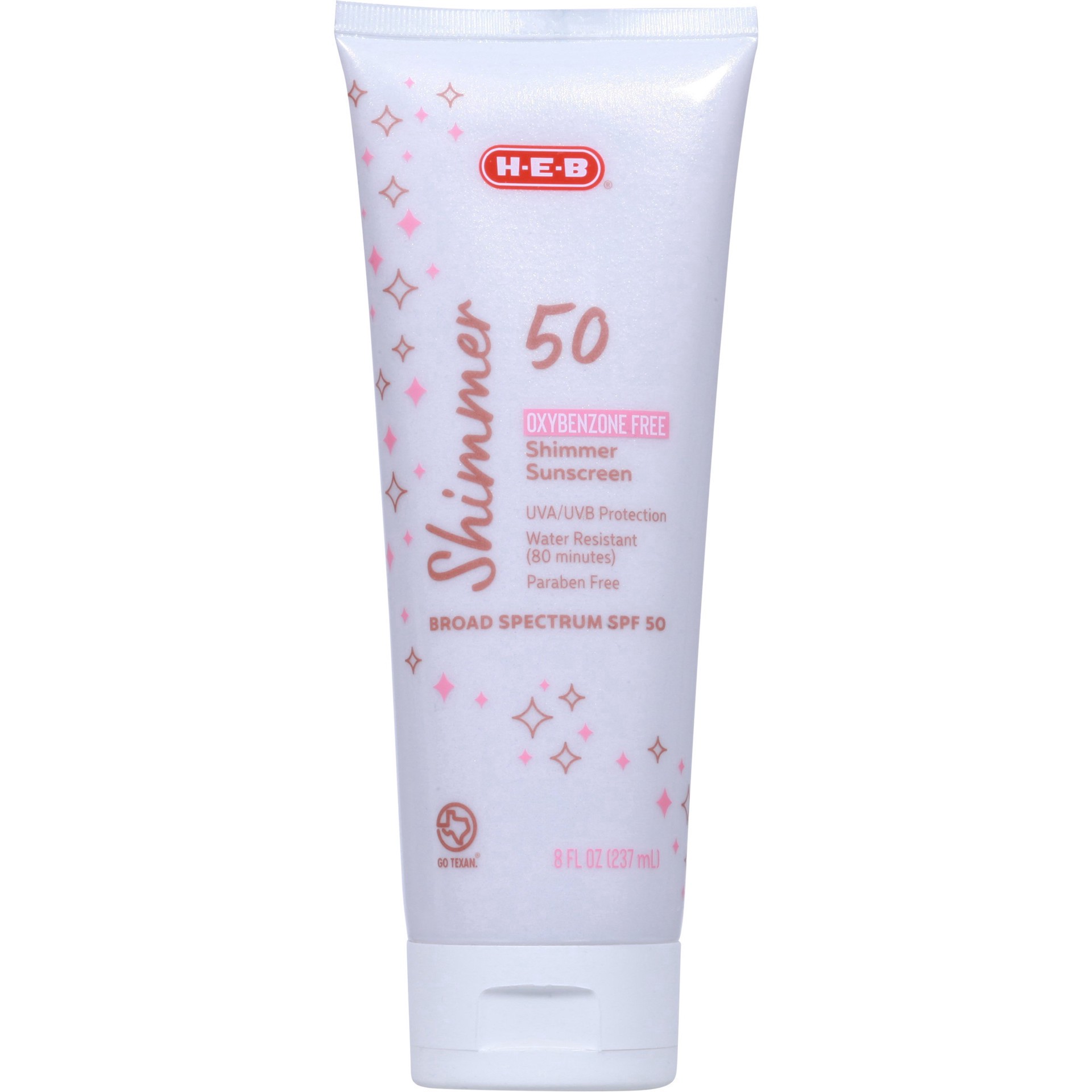 Apply this H-E-B shimmer oxybenzone free sunscreen lotion and give your skin a glow that shimmers under the sun. Water resistant for up to 80 minutes, this SPF 50 sunscreen is what you need for the po…