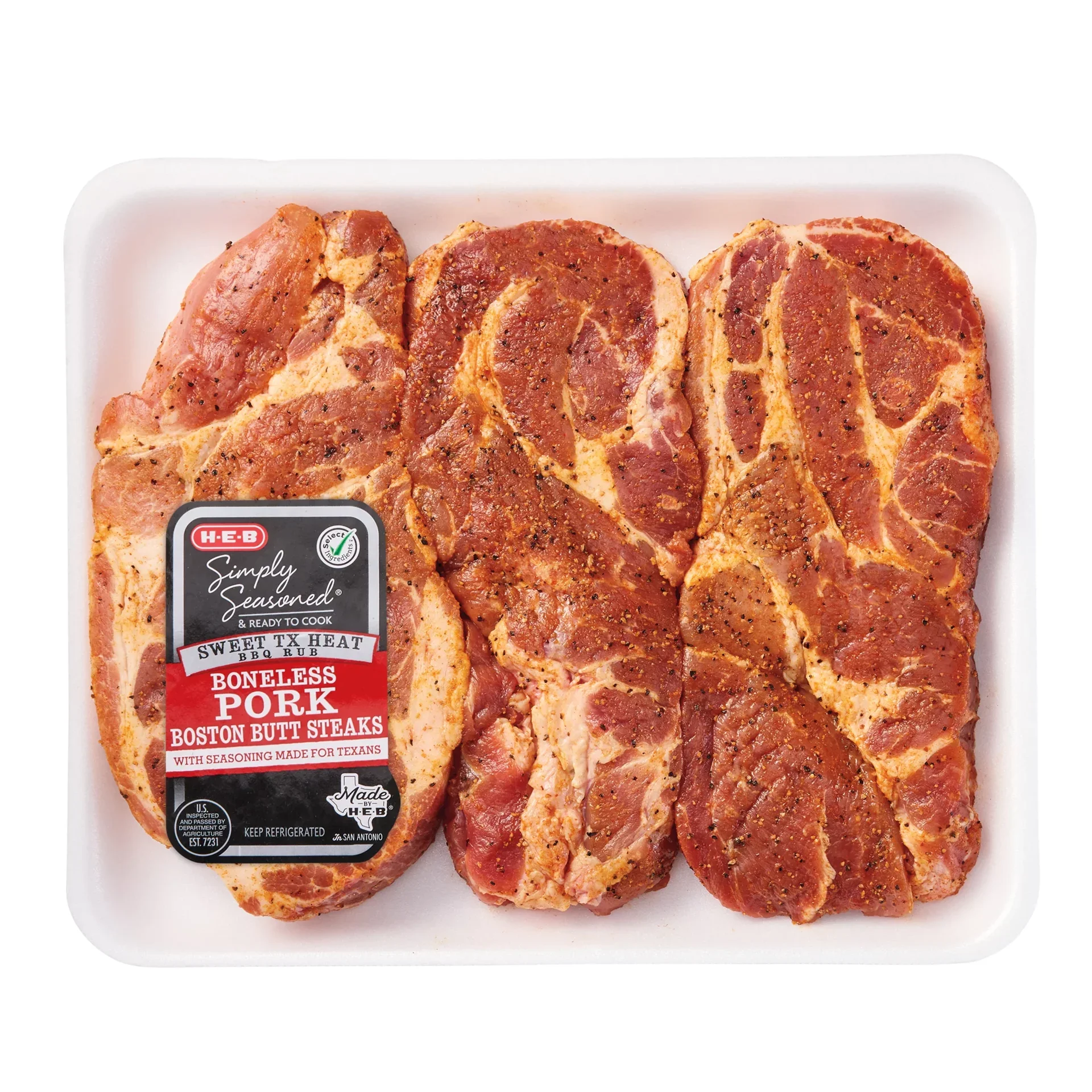 H-E-B Simply Seasoned Boneless Boston Butt Pork Steaks, Extra Thick Cut – Sweet TX Heat