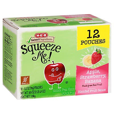 For a fun twist on the usual applesauce, try these H-E-B Squeeze Me! Pouches. They're triple the fruity goodness, made with real apples, strawberry puree and banana puree. Take one along with you on a…