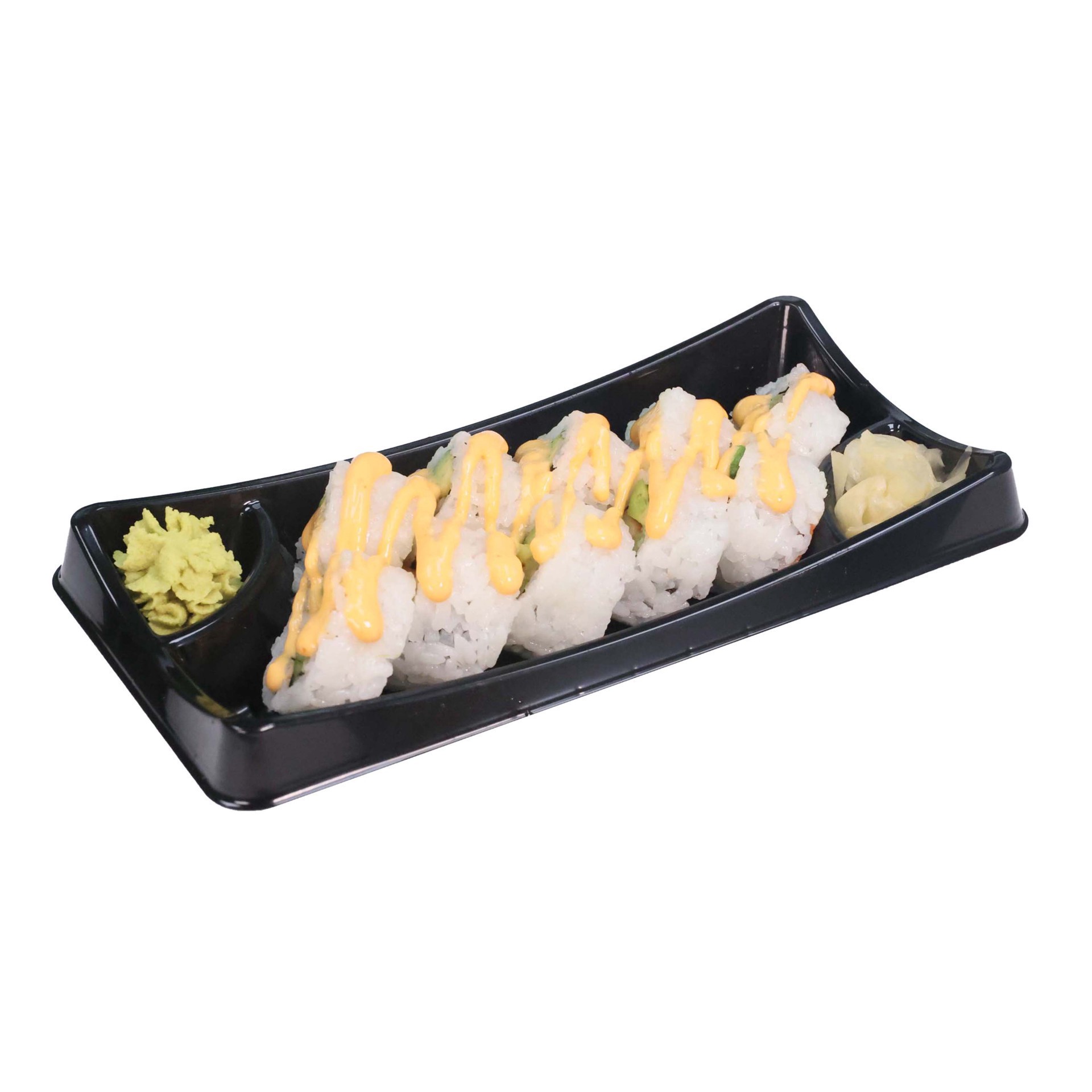 Liven up your usual lunchtime by enjoying this Kosher Spicy California sushi roll by H-E-B Sushiya. Freshly made in store with imitation crabmeat, avocado, cucumber and sushi rice, it's topped with sp…