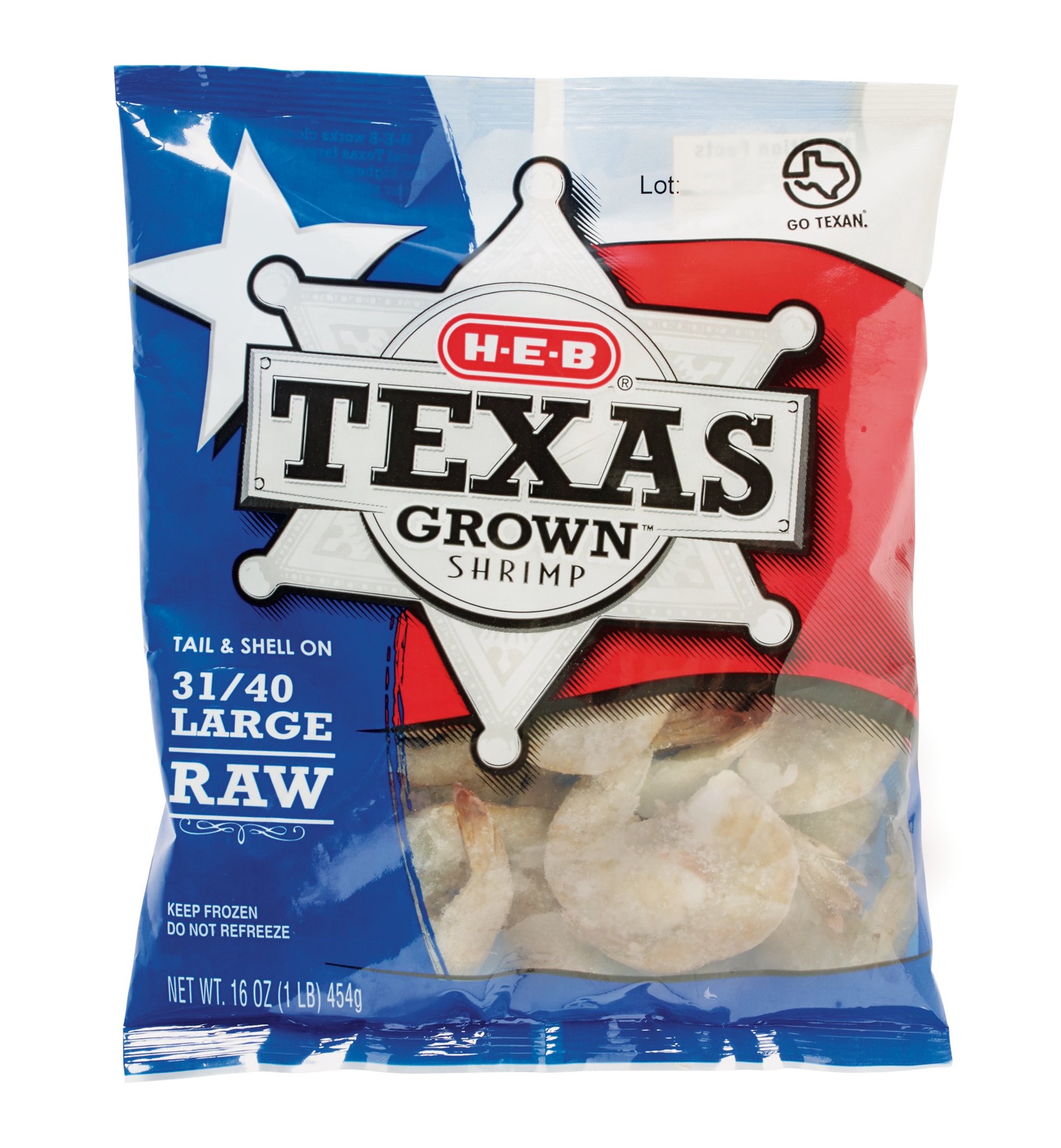 Raised in bay water ponds by local Texas farmers, these large H-E-B Texas Grown frozen shrimp are handy to have in your freezer. Shell-on including the tail, they're raw and ready to cook. This 1 lb b…