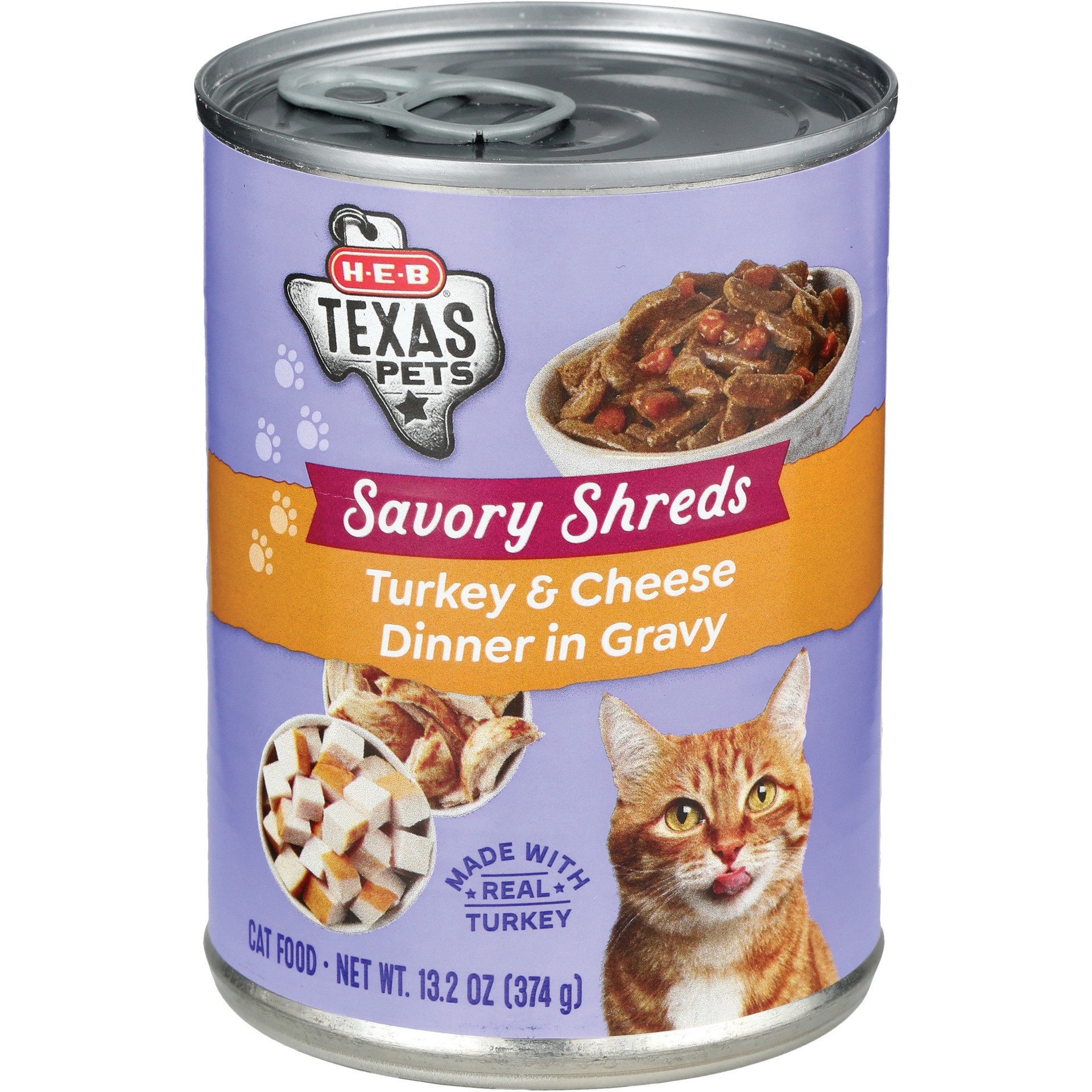Canned and gravy-based, this H-E-B Texas Pets wet cat food is a savory recipe of real chunks of turkey plus cheese. Pull the tab and watch your best feline friend come running - especially since there…