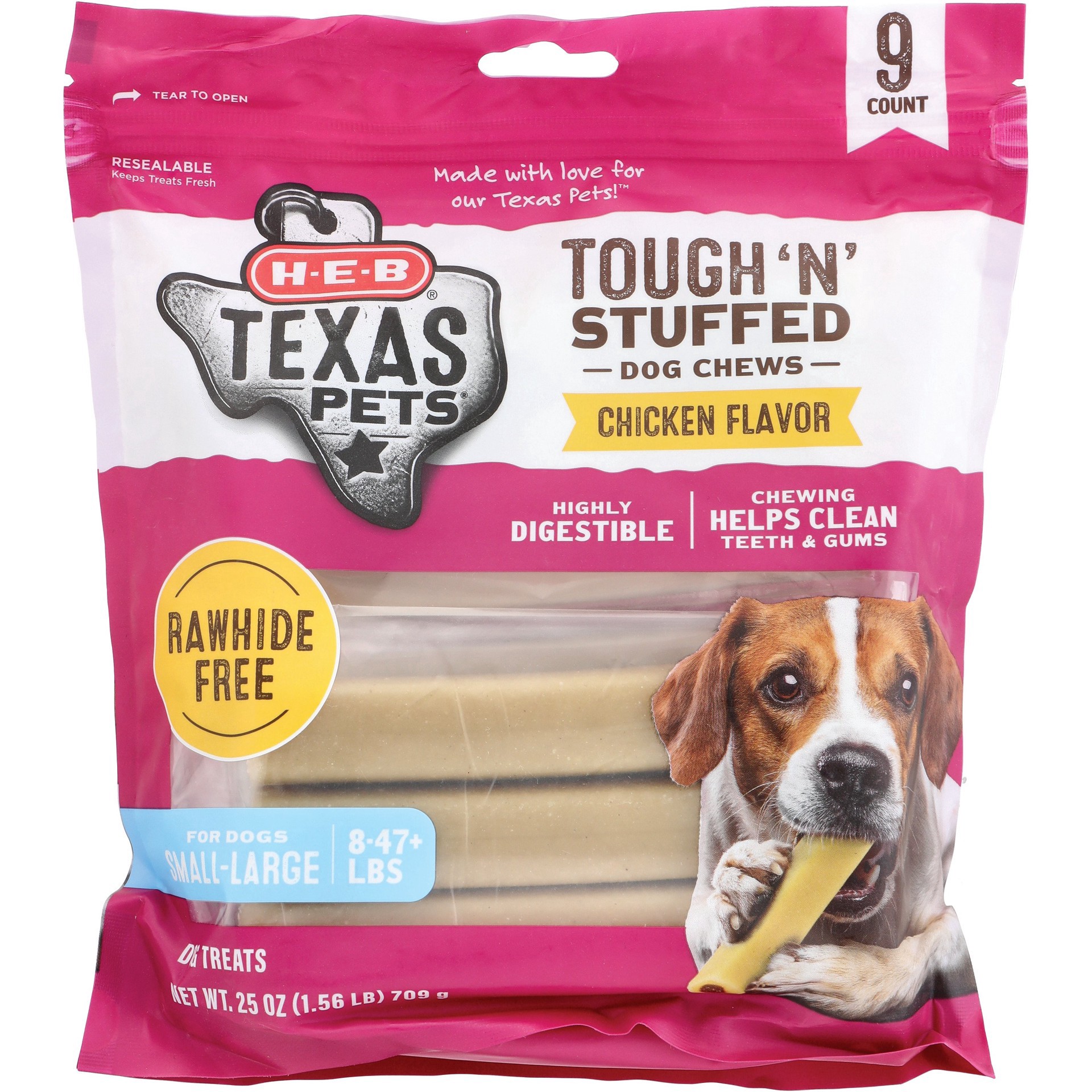 H-E-B®'s Texas Pets® Tough 'N' Stuffed Dog Chews in Chicken Flavor are the ultimate treat for your furry friend. These chews are packed with a savory chicken flavor that dogs find irresistible. The te…