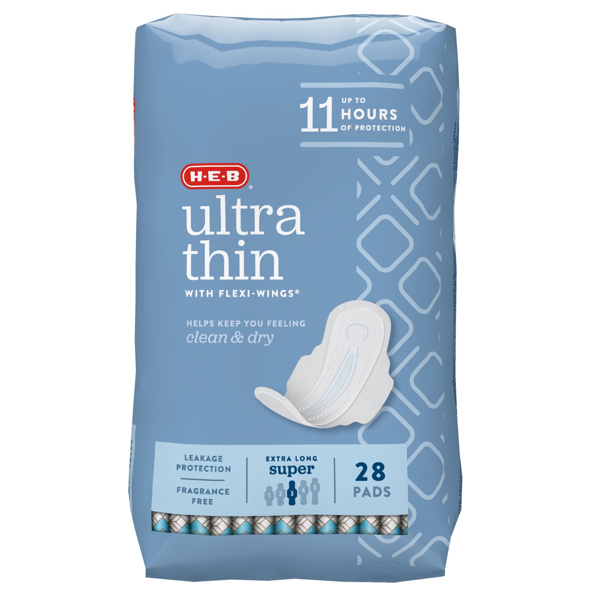 Our H-E-B Super absorbency Extra Long Ultra-Thin Pads provide up to 11 hours of protection to help keep you feeling clean and dry throughout your busy day. Flexi-Wings ® and the adhesive strip help ke…
