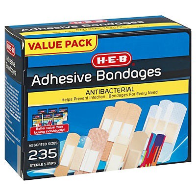 H-E-B Variety Pack Antibacterial Bandages are designed to help prevent infection with their antibacterial properties. This Texas-size pack includes 235 sterile strips in assorted sizes, ensuring you h…