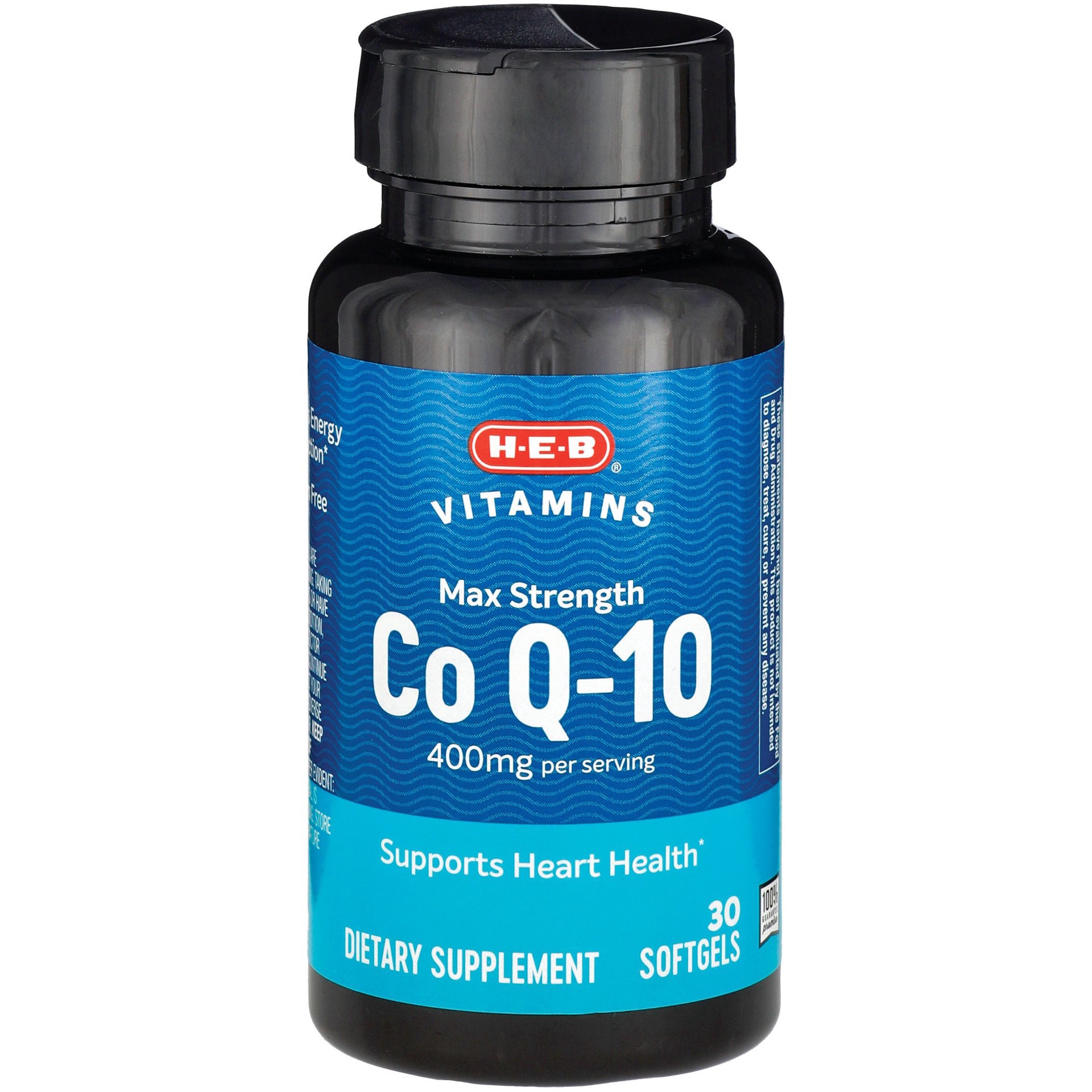 Take these H-E-B Co Q-10 softgels and get 400 mg per serving. Whether it's to support energy production or to support heart health, add these softgels to your routine.• 30-count bottle of 400 mg Co Q-…