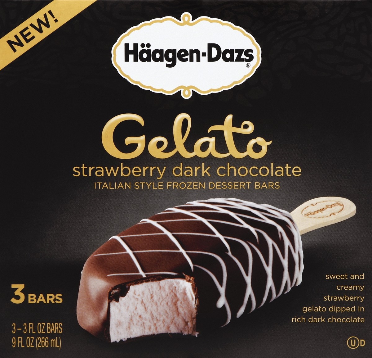 Italian style frozen dessert bars. Sweet and creamy strawberry gelato dipped in rich dark chocolate. New! Meet Haagen-Dazs ice cream's Italian cousin, gelato. Sweet and creamy strawberry gelato dipped…