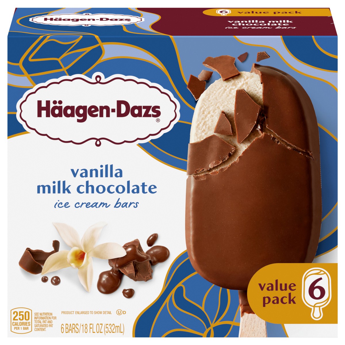 Häagen-Dazs Vanilla Milk Chocolate Ice Cream Bars are pure, sweet vanilla blends with sweet cream to make our incredibly smooth vanilla ice cream. Dipped in a milk chocolate coating and drizzled with …