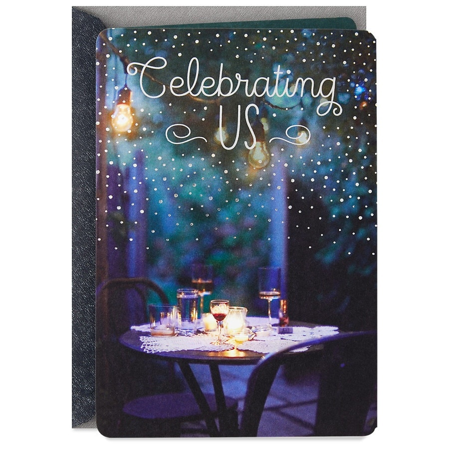 Celebrate your love with this romantic greeting. Hallmark anniversary card for your wife, husband or partner features an outdoor table with hanging lights and shiny foil accents. Visit the Hallmark de…
