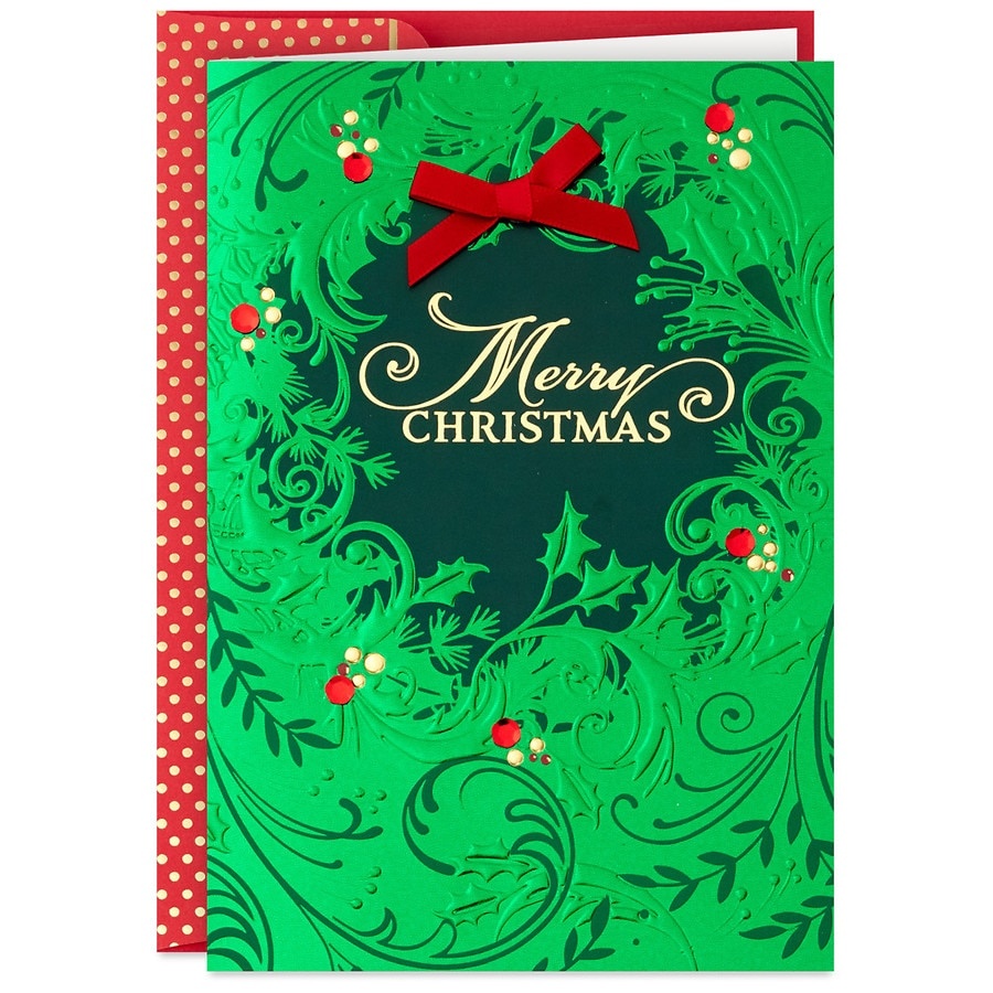 Spread Christmas joy with this box of Christmas cards featuring a green foil wreath with sequin and ribbon attachments. Hallmark boxed holiday cards feature favorite seasonal icons, highquality paper …