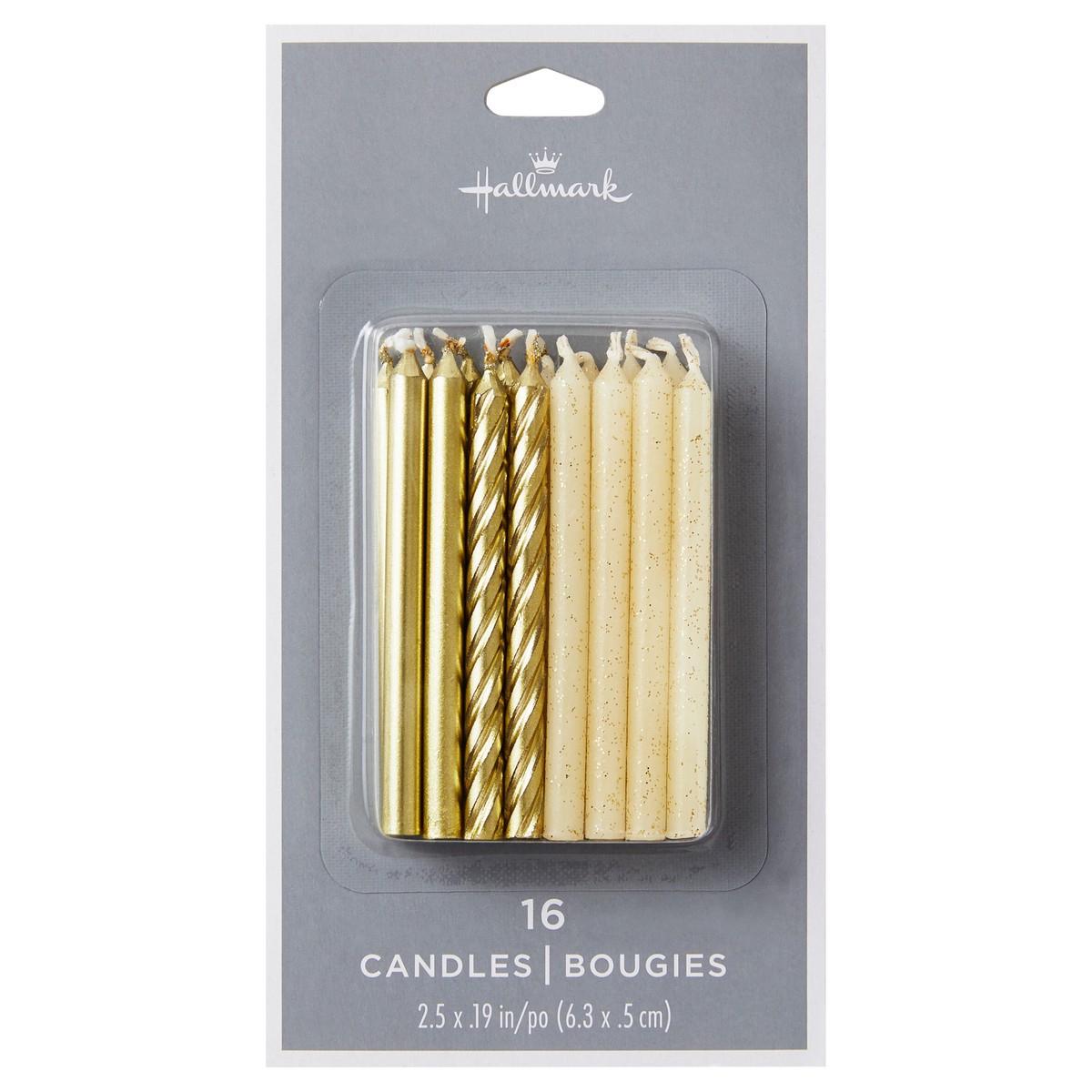 Top a birthday cake in elegance with these gold birthday candles in solid\, spiral and glitter styles. Set includes 16 wax candles for beautiful birthday and anniversary parties.