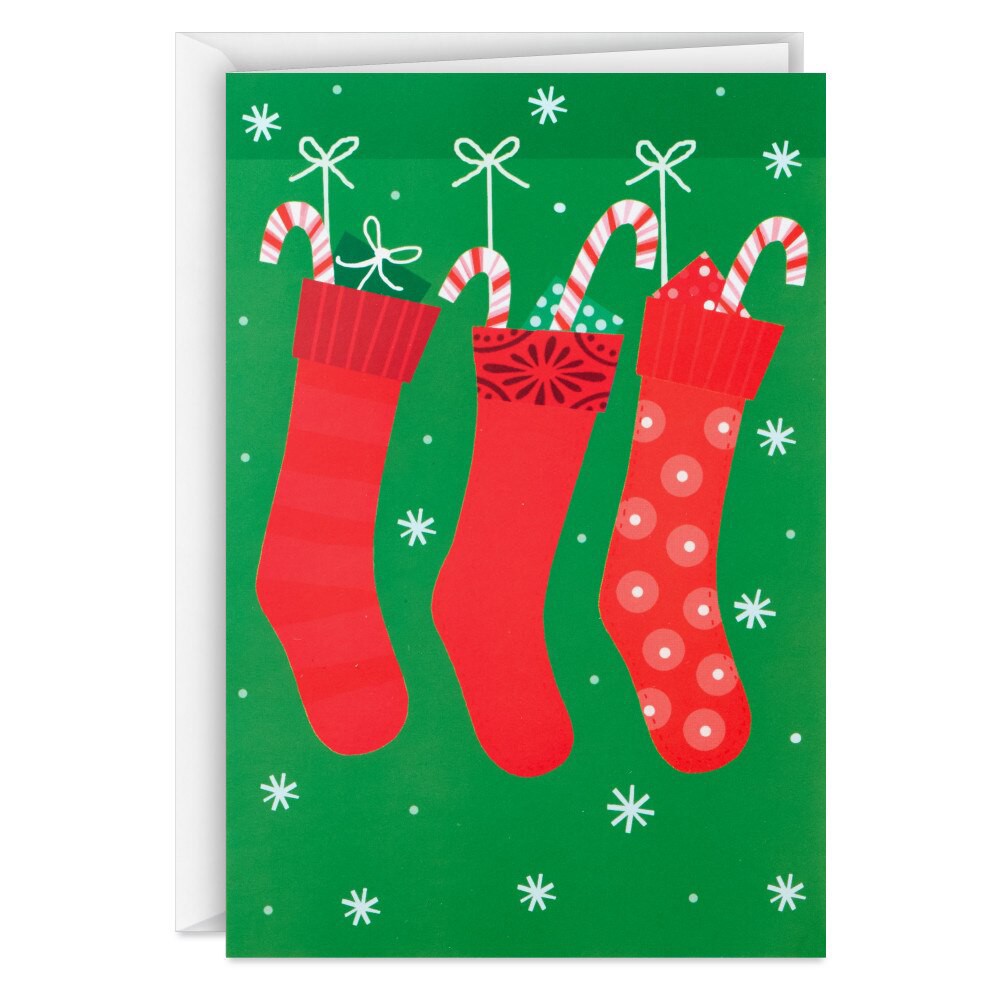 Hallmark Image Arts Red Stockings On Green Boxed Christmas Cards, Pack Of 16