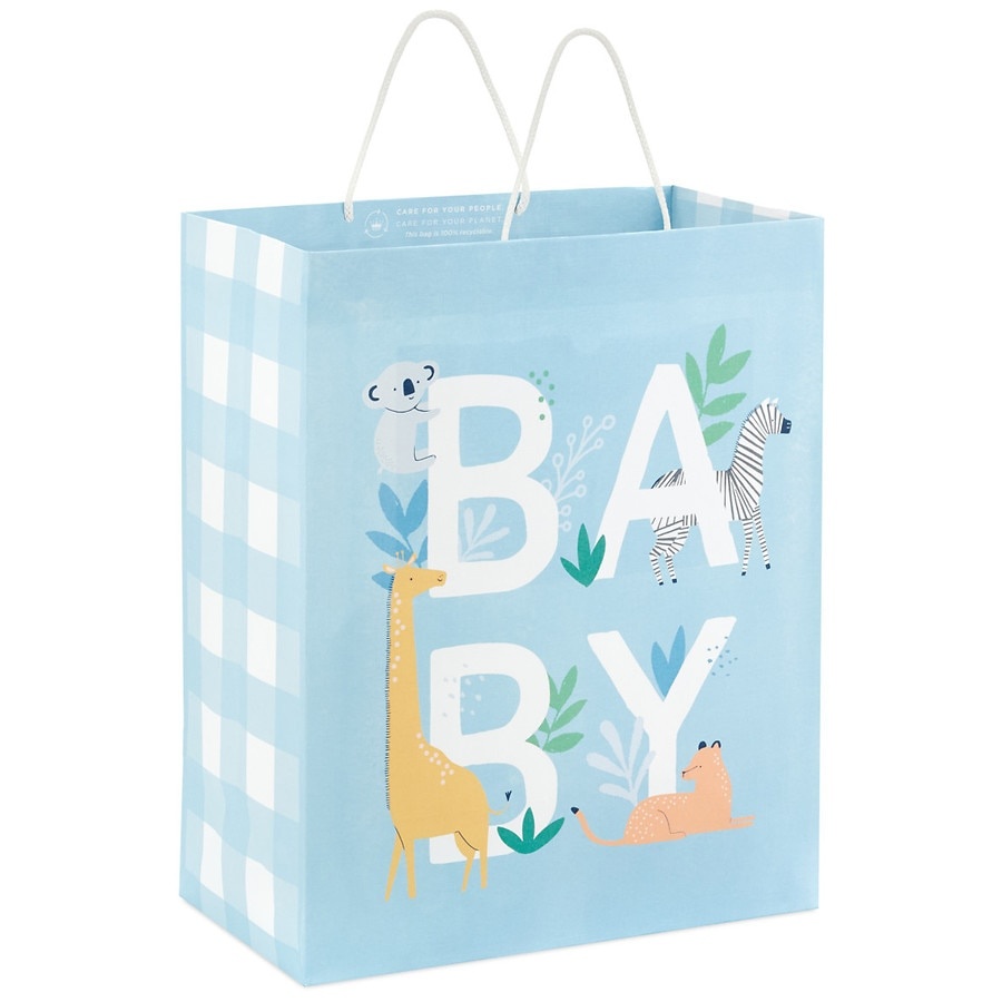 Bring a cute and cuddly gift tucked inside this 100 recyclable baby gift bag. Large bag features BABY lettering and sweet animal illustrations on a pastel blue background. Visit the Hallmark departmen…