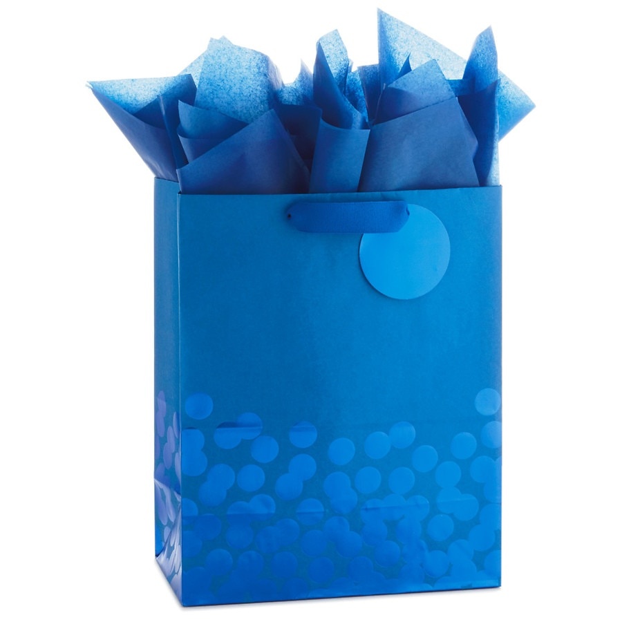 Share a holiday, graduation or birthday gift with this modern gift bag and tissue paper set. Ready-to-go large blue gift bag features a polka-dot pattern in blue foil, a coordinating gift tag, plus 3 …