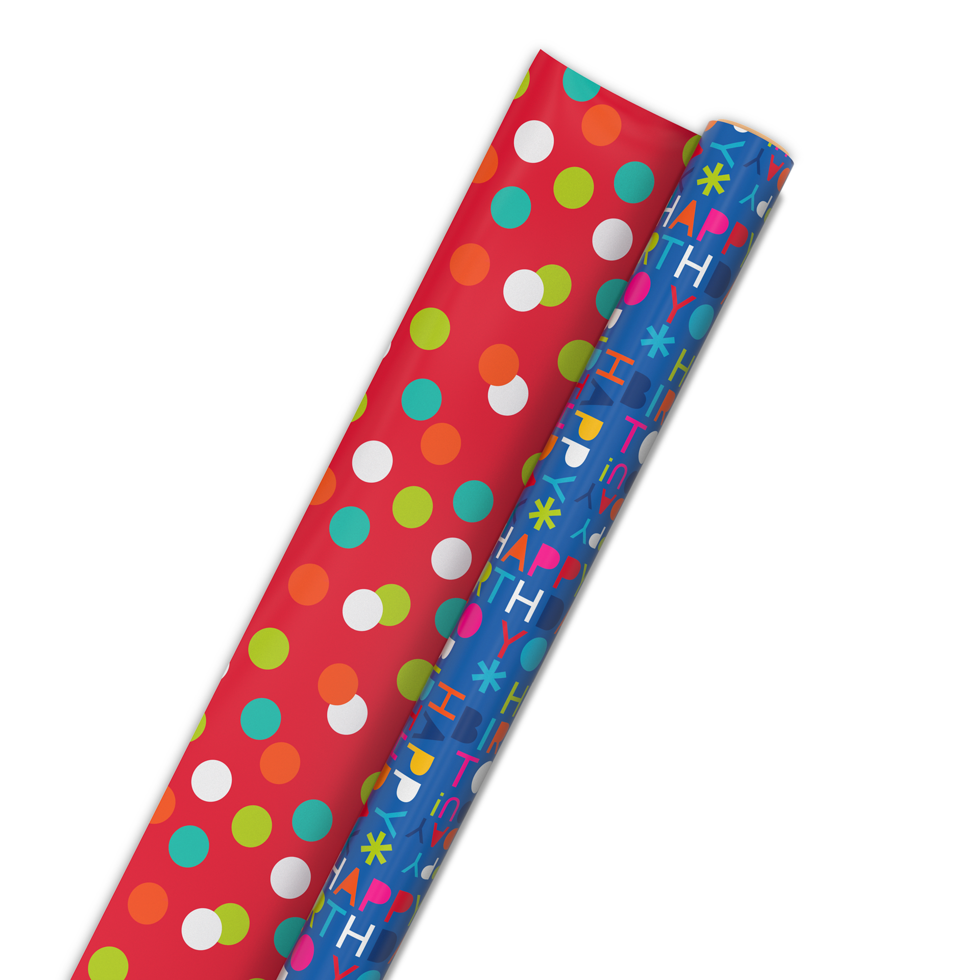 Hallmark Reversible Birthday Wrapping Paper, Blue Happy Birthday and Red with Dots (1 Roll: 20 sq. ft.)