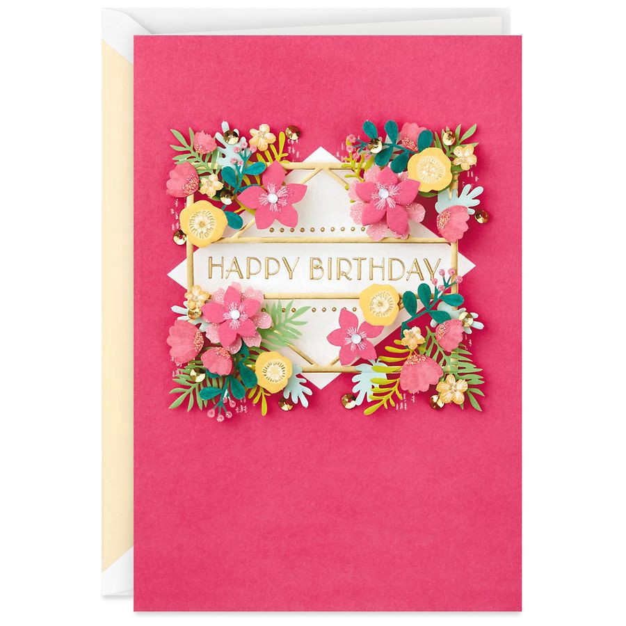 Brighten her day with this beautiful birthday card. Hallmark Signature birthday greeting card features layers of intricate laser-cut paper flowers framing a happy birthday wish. The Hallmark Signature…
