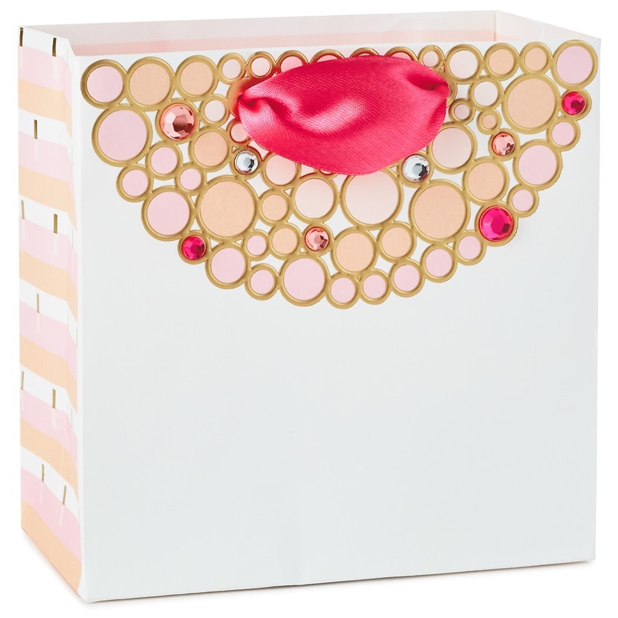 Give her a gift she truly deserves in this jeweled and gold trimmed bag. Small square gift bag features multiple gemstones and gold foil accents on the front. Back of the bag features a striped patter…