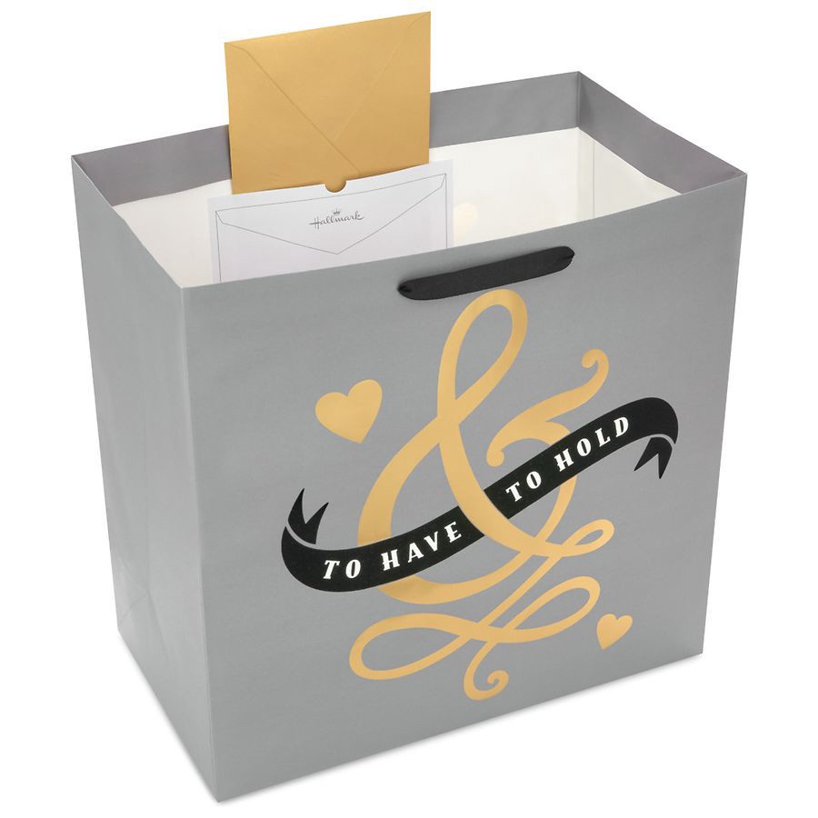 Celebrate their wedding, engagement or bridal shower in style with this elegant gift bag. Design features metallic gold hearts and accents on gray with message that reads To Have To Hold. Perfect for…