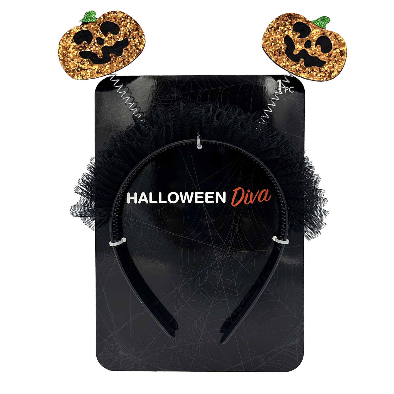 Halloween Boppers with glitter pumpkins speak true celebration! Orange glittery pumpkin heads extend above a tulle trimmed headband to bring out laughter as you go. Shake your head with this playful a…
