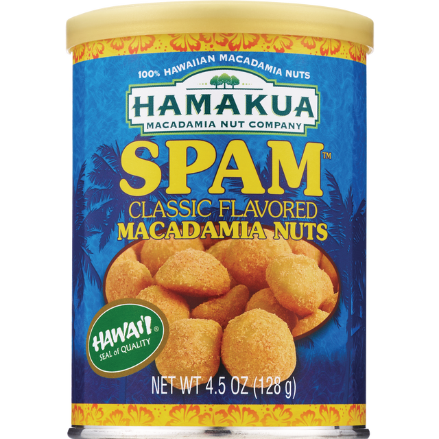 Dry Roasted Hawaiian Macadamia Nuts, SPAM Brand Flavoring (Maltodextrin, Sugar, Autolyzed Yeast Extract, Salt, Cornstarch, Natural Flavor, Red 40 Lake, Tricalcium Phosphate [Anticaking Agent]), Salt