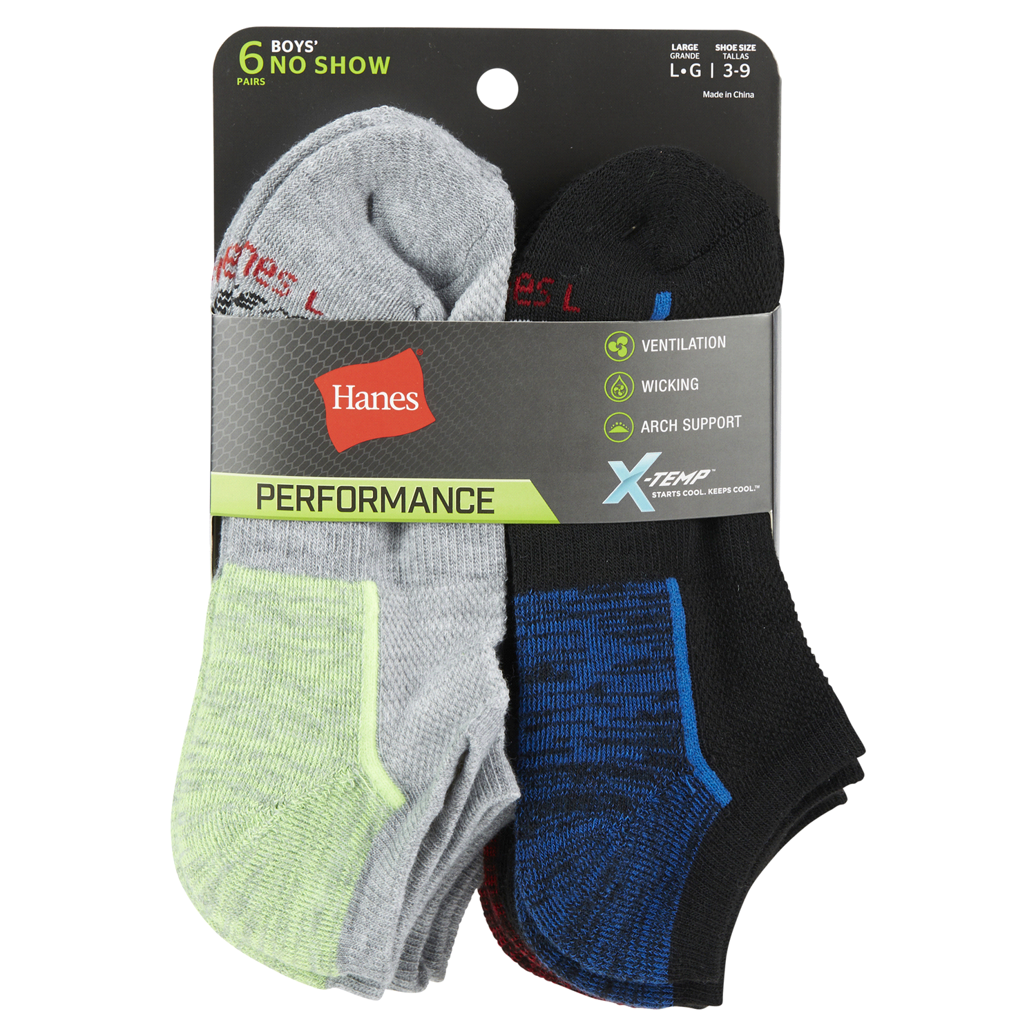 Hanes Boys' X-Temp No-Show Socks, Black/Gray, 6 Pack, Size Large