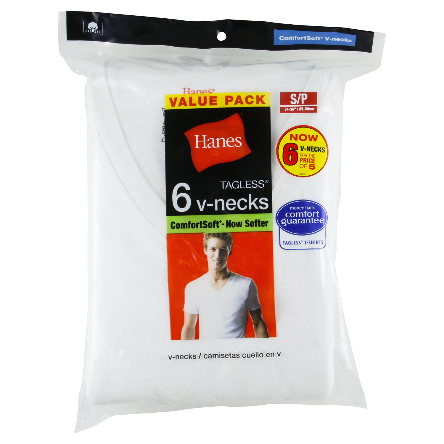Hanes Men's White V-neck Tees are available in a convenient pack of 6. With super soft ComfortSoft fabric, these tees offer everyday, all day comfort from the brand you trust. FreshIQ advanced odor pr…