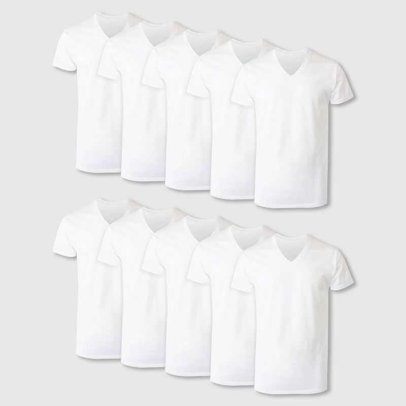 - EVERYDAY VALUE PACK - This handy 10-pack of classic white V-neck tees makes stocking up simple, giving you dependable undershirts for the whole week with fewer shopping trips and easy drawer organization.