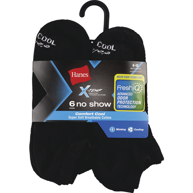 Hanes Men's X-Temp Comfort Cool Socks No Show Sz6-12 Blk 6Pr