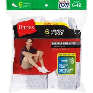 Durable elastic ribbing. Double tough extra reinforced grey heel and toe. Extra thick cushioned foot. Comfortable stay-up top. Hanes Red Toe Seam guarantees long lasting comfort. Fits shoe size 6-12.