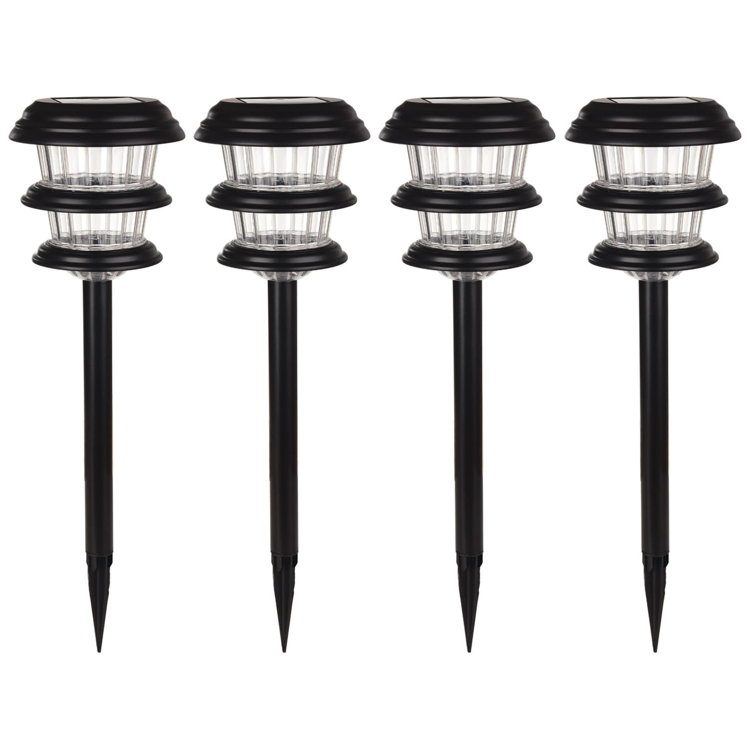 4-Pack solar LED pathway lights, package includes (4) lights, (4) nickel cadmium AA solar rechargeable batteries and (4) stakes. Ideal for illuminating pathways, gardens and patio spaces. Durable meta…