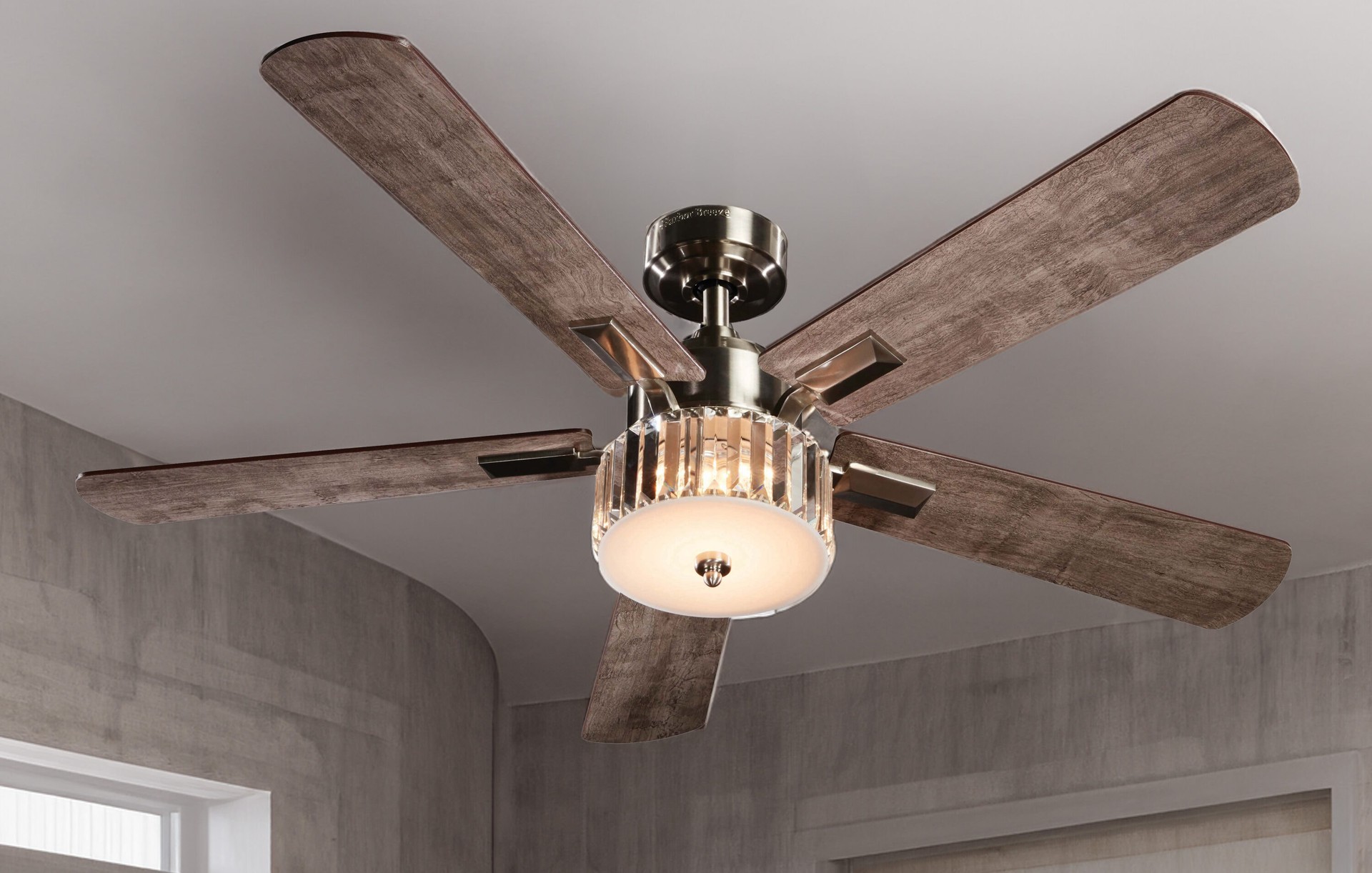 Brushed nickel ceiling fan from the Elms collection features 5 reversible blades with gray and walnut finishes. Decorative crystal indoor ceiling fan for large rooms with a dimmable integrated LED lig…