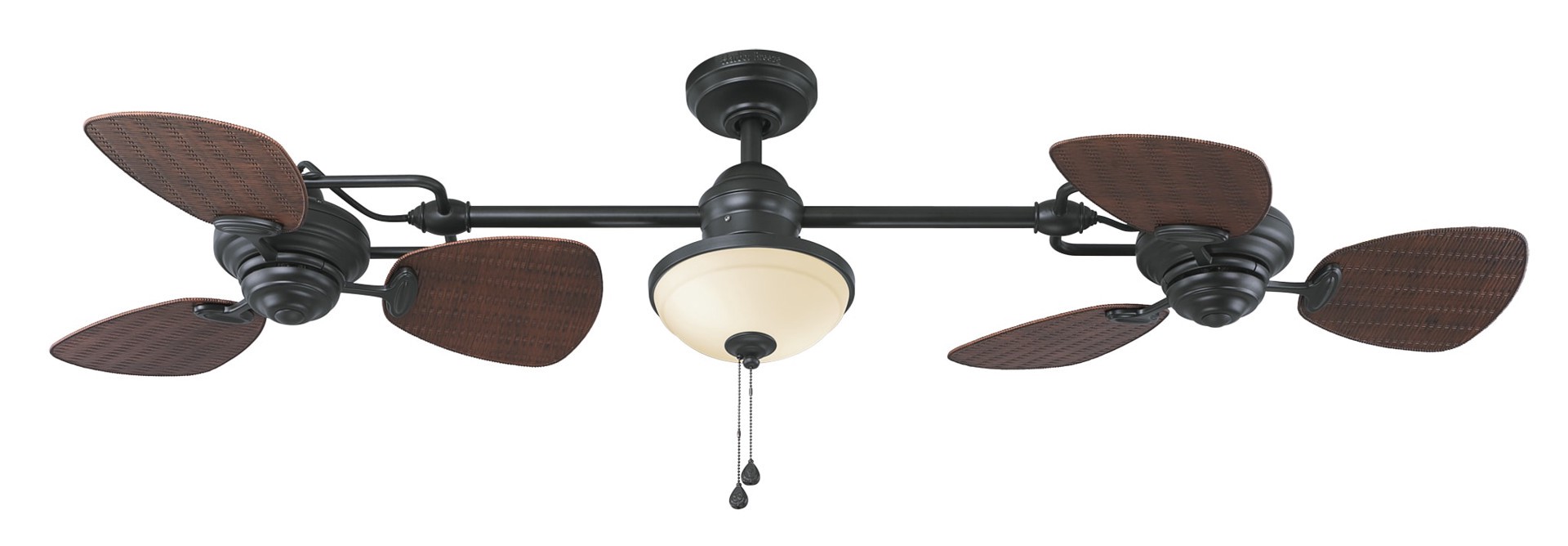 Oil rubbed bronze finish indoor/outdoor ceiling fan from the Twin Breeze II collection features two fan heads with 6 wicker blades. Integrated frosted glass light kit offers a warm glow (bulbs include…