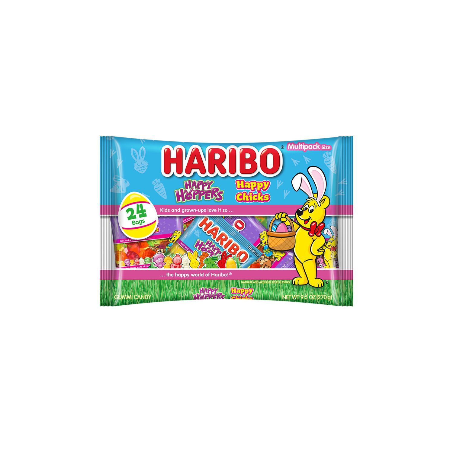 This laydown bag has 24 treat-sized bags, including both fruity and chewy Happy Hoppers and Happy Chicks.