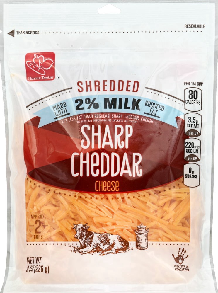 Made with 2% milk. 1/3 less fat than regular sharp cheddar cheese. See nutrition information for saturated fat content. Approx 2 cups. Per 1/4 Cup: 80 calories; 3.5 g sat fat (18% DV); 220 mg sodium (…