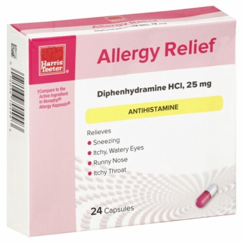Active Ingredients: Diphenhydramine HCl (25 mg). Inactive Ingredients: Benzyl Alcohol, Butylparaben, D&C Red 28, Edible Black Ink, FD&C Blue 1, FD&C Red 40, Gelatin, Lactose, Magnesium Stearate, Methy…