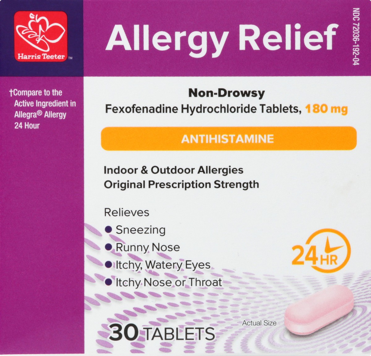 Fexofenadine hydrochloride tablets\, 180 mg. Compare to the active ingredient in allergra allergy 24 hour (This product is not manufactured or distributed by Chattem\, Inc.\, distributor of Allegra Al…