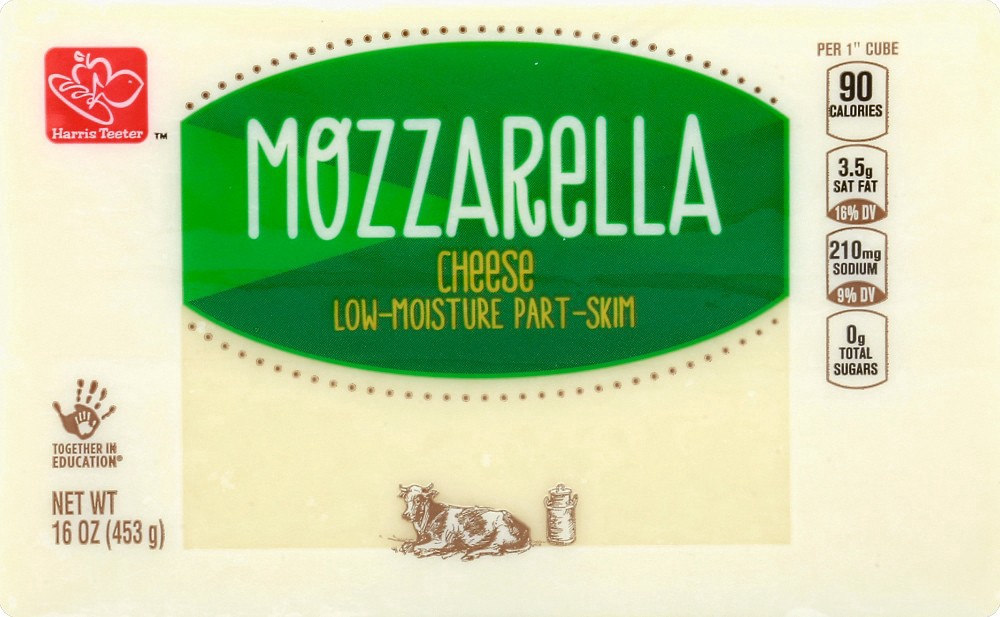 Low-moisture, part-skim. 80 calories, 3.5 g sat fat (18 DV), 170 mg sodium (7% DV), 0 g sugars, calcium (20% DV) per 1 oz. Your plus guarantee. Together in Education: Support your local schools. Toget…
