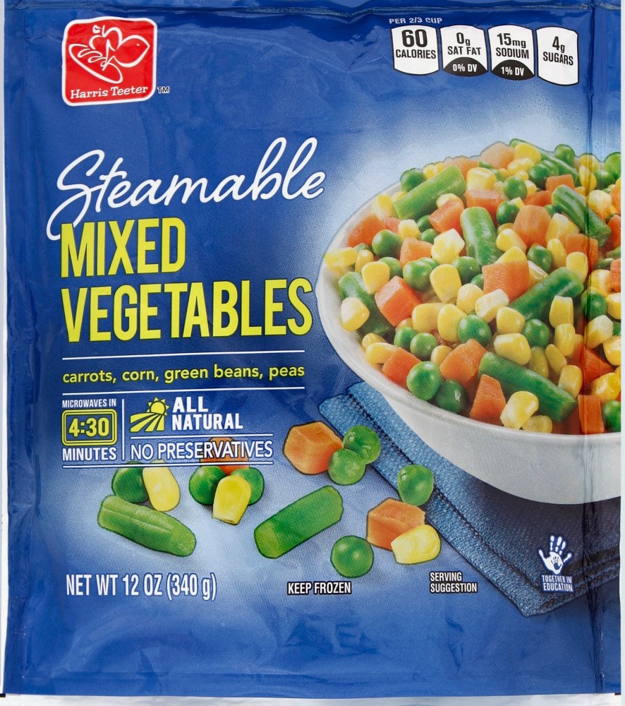 Carrots, corn, green beans, peas. Per 2/3 Cup: 60 calories; 0 g sat fat (0% DV); 15 mg sodium (1% DV); 4 g sugars. Microwaves in 4:30 minutes. All natural. No preservatives. Together in Education. You…