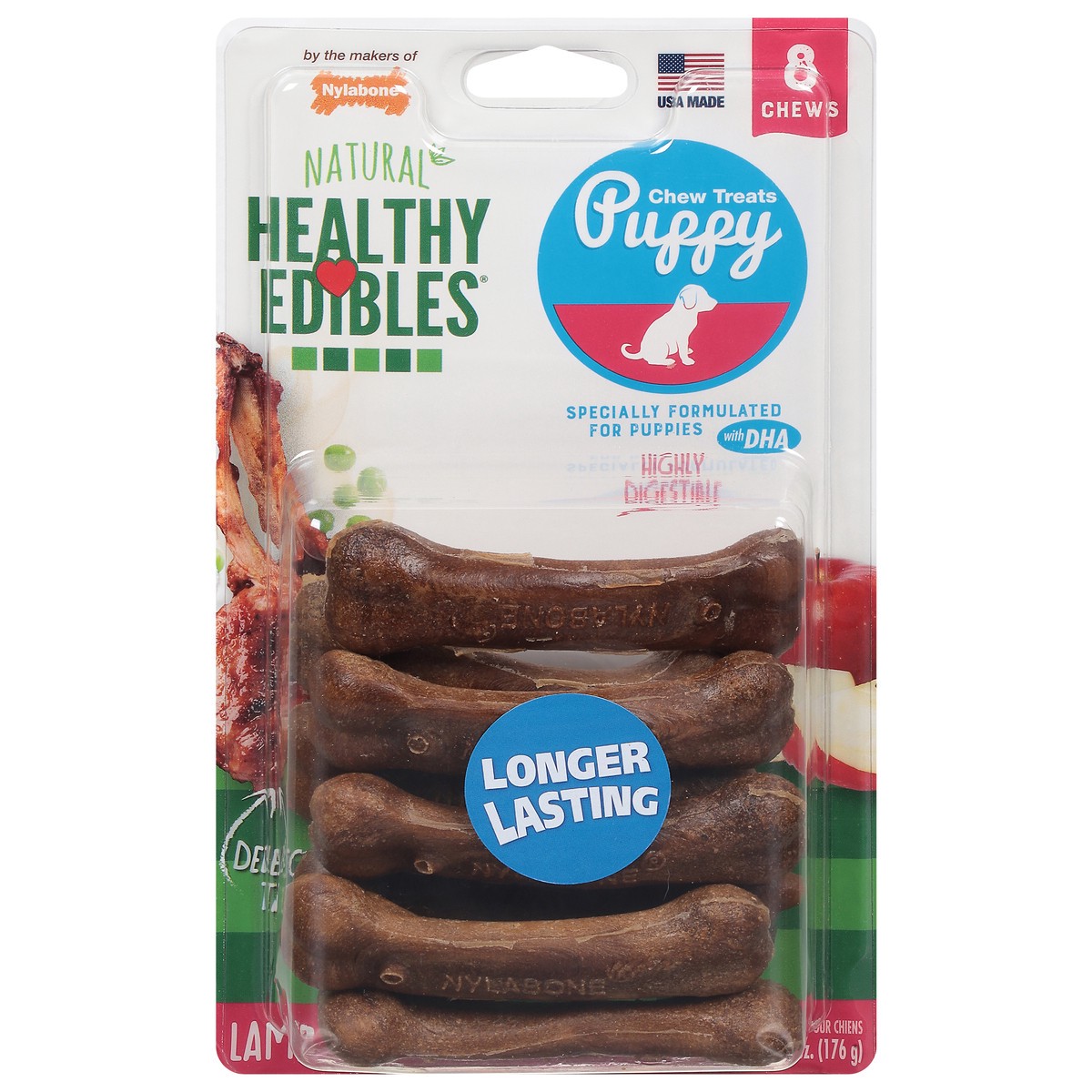 Wheat Starch, Vegetable Glycerin, Pea Protein, Natural Flavor, Powdered Cellulose, Lecithin, Dried Chicken, Calcium Carbonate, Apple, Potato Starch, Oat Hulls, Fish Oil, Lamb Meal, Natural Bacon Flavo…