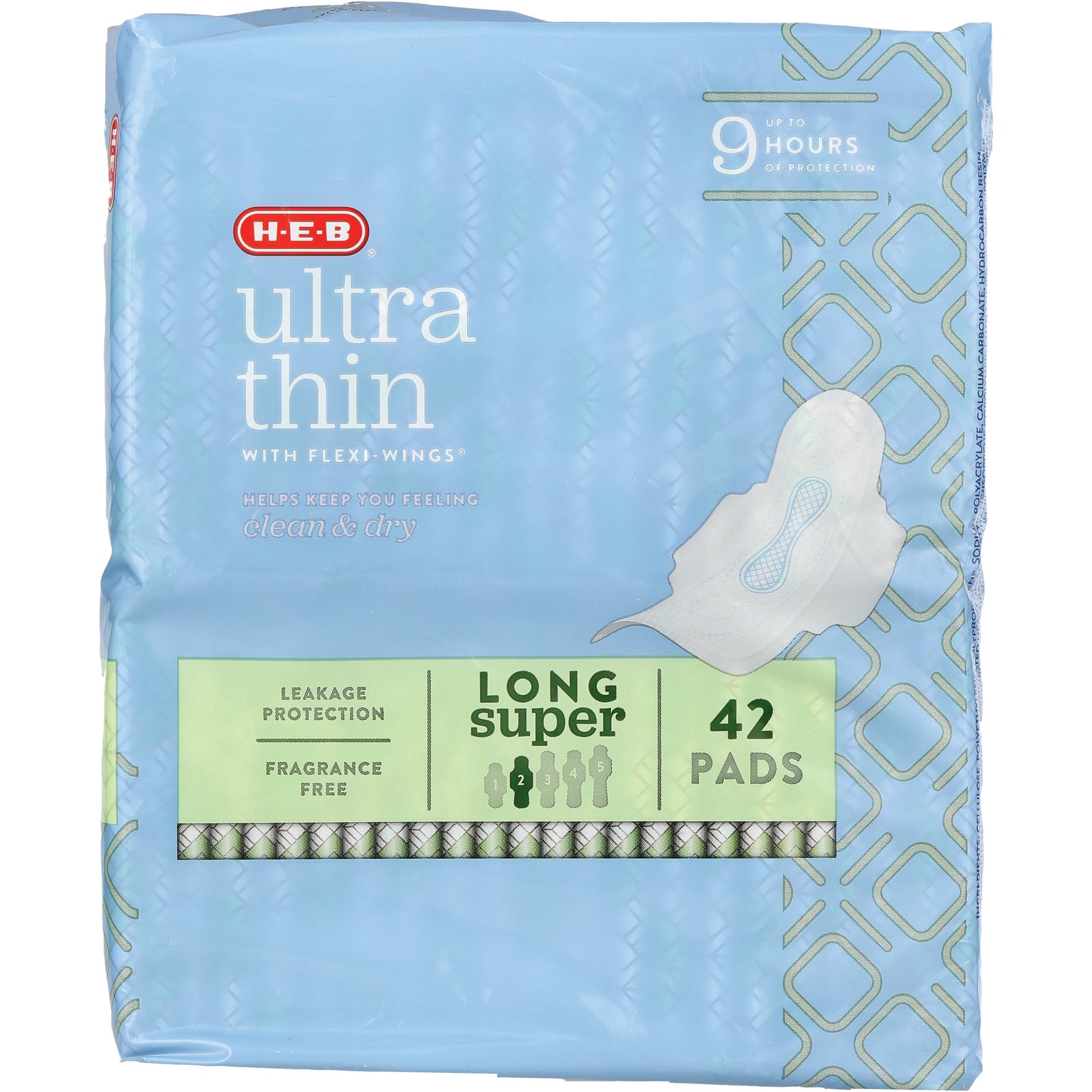 Our H-E-B Ultra Thin Flexi-Wing Pads - Extra Long, Super, Unscented provide up to 11 hours of protection to help keep you feeling clean, dry, and confident. Designed for extra heavy flow, these ultra-…