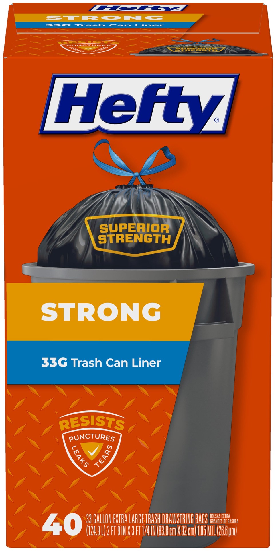 EXTRA LARGE TRASH BAGS—This package contains 40 Hefty Strong extra large, black, unscented, 33 gallon trash bags, each 1.05 millimeters thick. TOUGHNESS YOU CAN TRUST—Thicker plastic makes these garba…