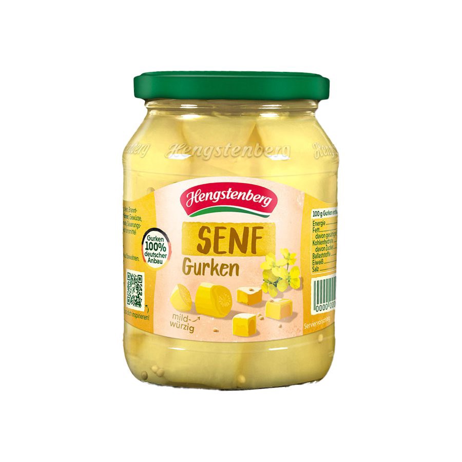 Mustard and pickled cucumbers? A perfect match. Our Hengstenberg mustard pickles combine evenly sliced, bite-sized cubes of pickled cucumber with a delicate, sweet and spicy mustard flavor. An excepti…